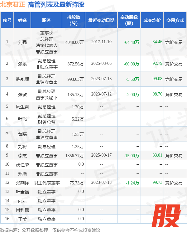 北京君正的高管列表及最新持股情况如下: